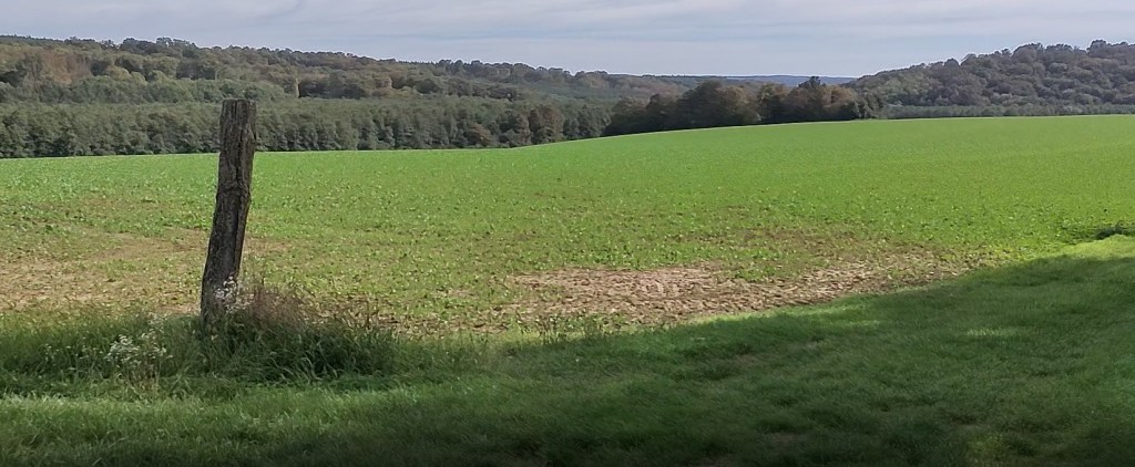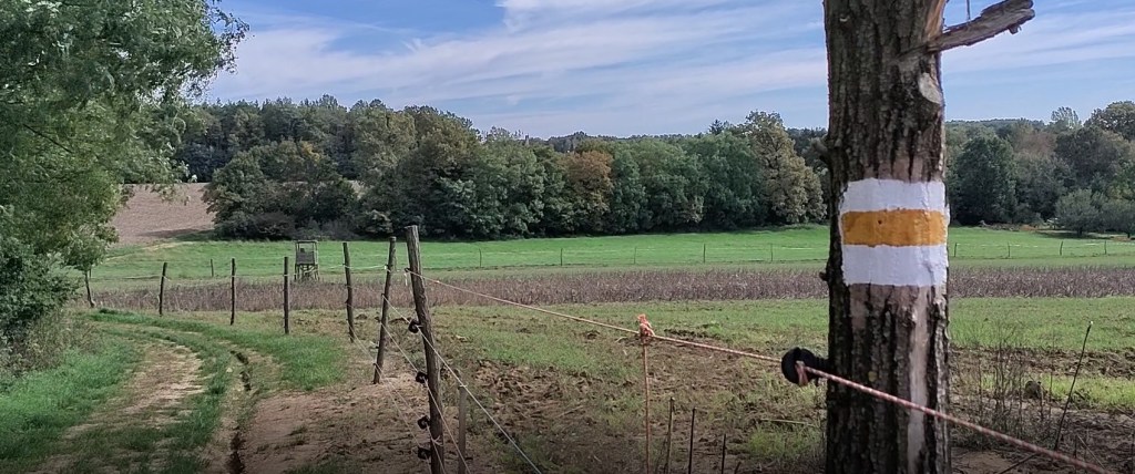 Elhagyom a bel-, majd a külvárost is, zöldellő ligetek mellett érek az elővárosba, ahol egy teremtett lélekkel sem találkozom. Utamat szelíd lankák és hosszú egyenesek váltogatják, a kék alapon sárga fésűskagyló, a zarándokok nemzetközi jelzése, többnyire jól követhető.