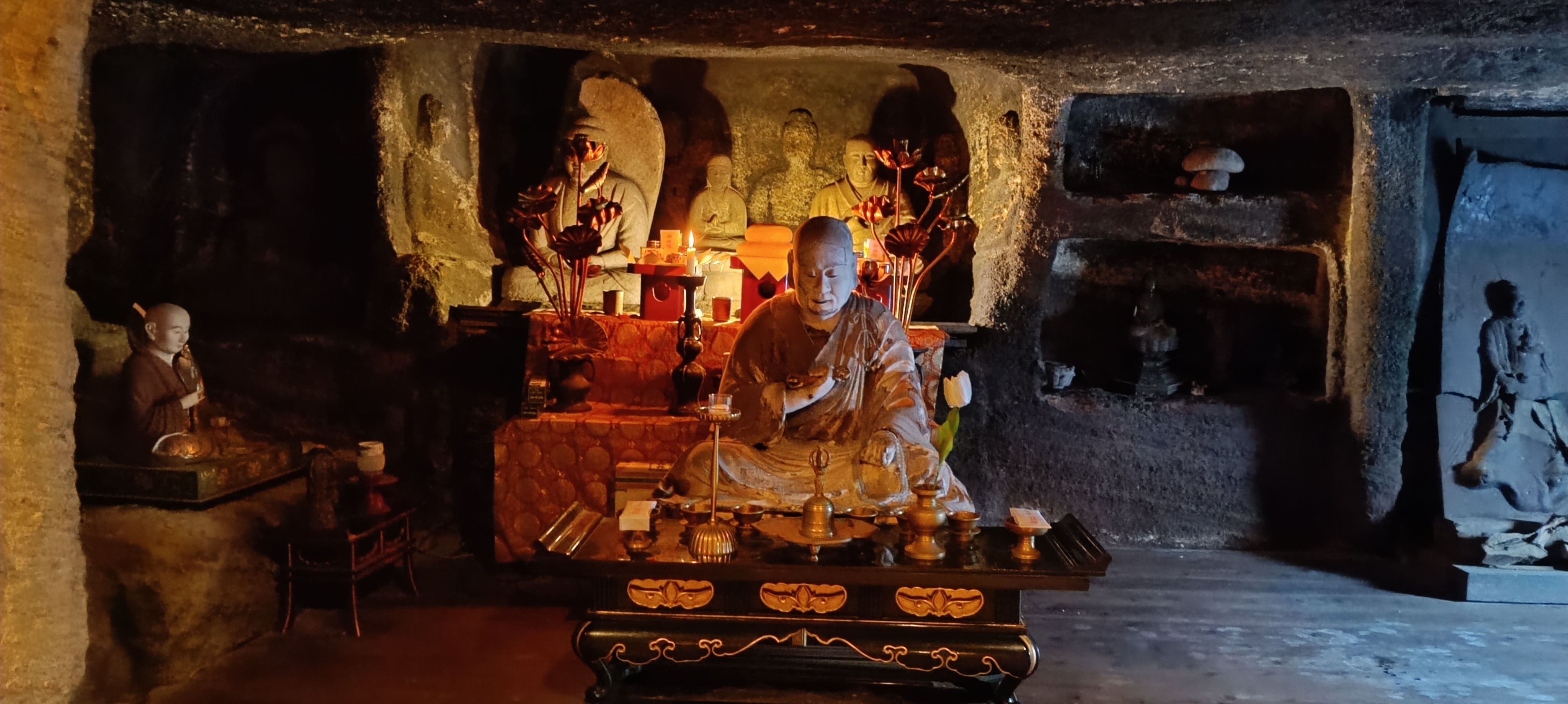 A Zentsu-ji templomban vagyunk, amelyik a 75. a sorban. Kiemelt szerepét a templomok között annak köszönheti, hogy Kobo Daishi szerzetes, a zarándokút és a shingon buddhista vallási irányzat alapítója ebben a városban, a leírások szerint éppen itt született. Itt, valahol. Mert hogy éppen vaksötétben tapogatódzom előre – vagy valamerre. Az alagút jobbra-balra kanyarog, és ami a világhoz köt ezekben a pillanatokban az a két talpam, amely a viszonylag egyenletes talajhoz ér, és bal kezem ujjainak idegvégződései, amik pontosan közvetítik az alagút falának sima, megnyugtató érintését.
