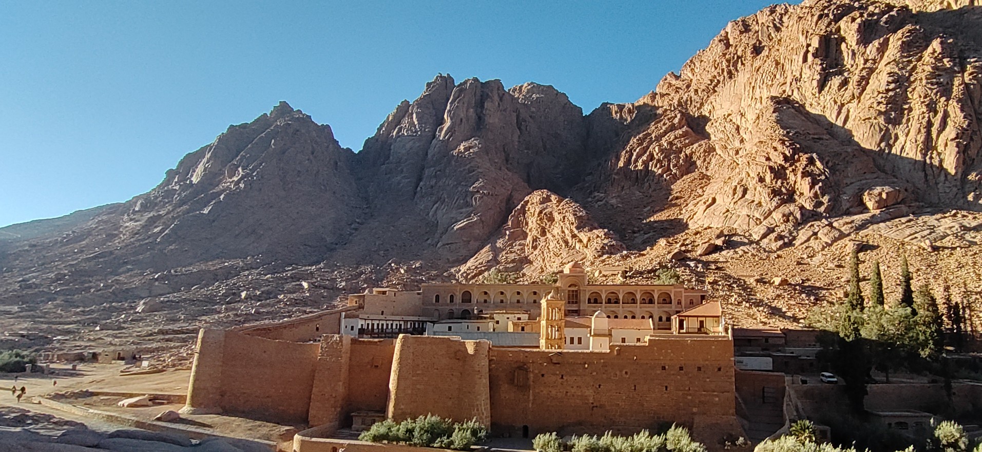 Ha lejjebb ereszkednénk, már észrevennénk az élet nyomait. A poros karavánutak mentén hatalmas kősziklákat kerülgetnek lomha tevék és fürge terepjárók, arrébb, egy sötét szalag tűnik fel a hegyek között, rajta panorámabuszok, taxik és teherautók, amint egy hatalmas, homoksárga épületegyüttes felé igyekeznek. Ez a Szent Katalin kolostor. Innen a hegyoldalból úgy tűnik, mintha hatalmas kéz tartaná tenyerén az ezerötszáz éves épületet.