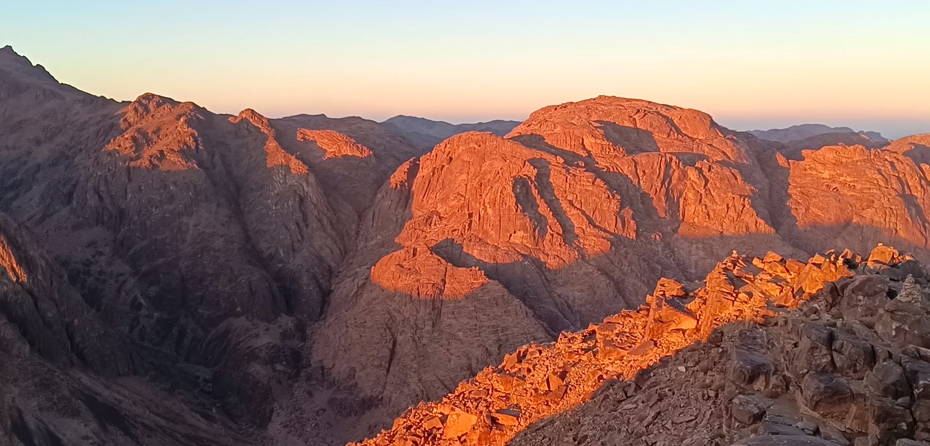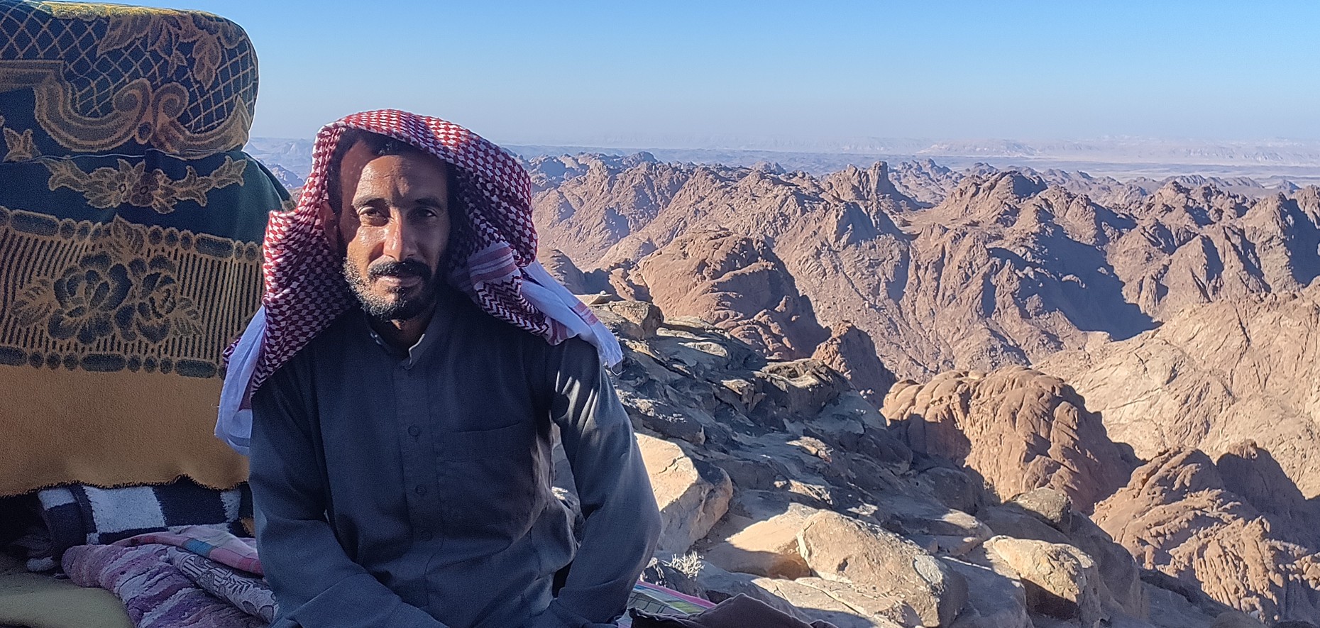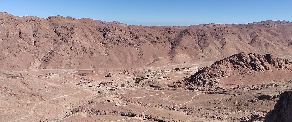 A Sinai-félszigeten vagyunk, annak déli részén, az Akabai-öböl és a Szuezi-öböl között, pontosan félúton. A történelem errefelé, mint egy fáradt zarándok, lassan vánszorog. Ha a zarándok repülni tudna, a magasból látná a negyvennapos út keletről nyugatra tartó ősi nyomvonalát, amely mint egy kis patak, kanyarog a hegyek között. Látná az égbeszökő gránitszirteket, a Sinai-félsziget és Egyiptom legmagasabb pontjait: A Szent Katalin-csúcsot (2629 m), vagy a Mózes-hegyet, amely 2285 méter magas, és aminek a csúcsára ma délután a zarándok feljutni szándékozik. Elláthatunk a Sinai-félsziget déli csücskéig, ahol turisták tömegei úszkálnak a Vörös-tengerben, ha pedig kelet felé fordítjuk a fejünket, a vörösesbarna hegyek fölött elláthatunk az Akabai-öböl túlpartjára, amely már a Jordán Királyság felségterülete.