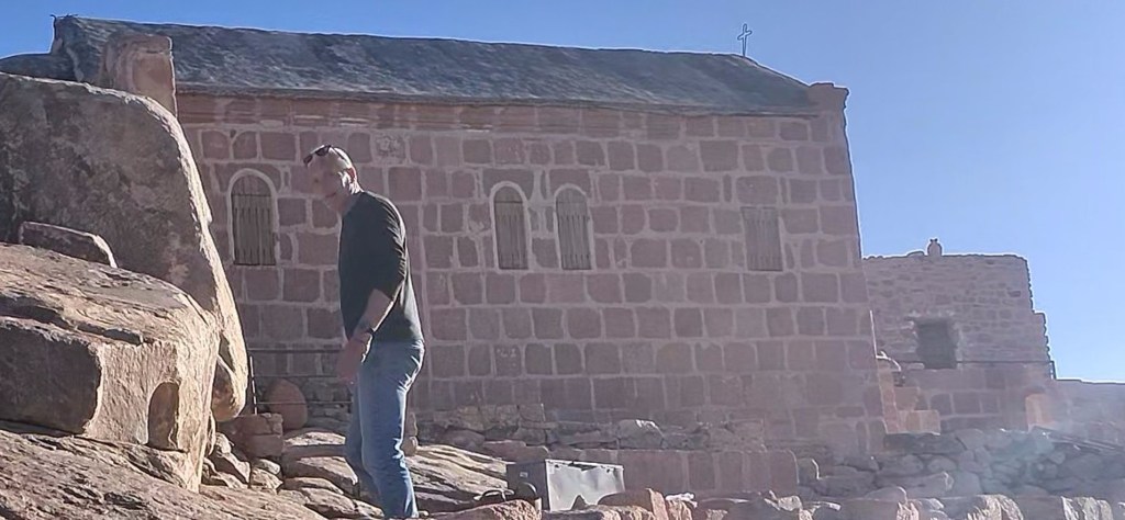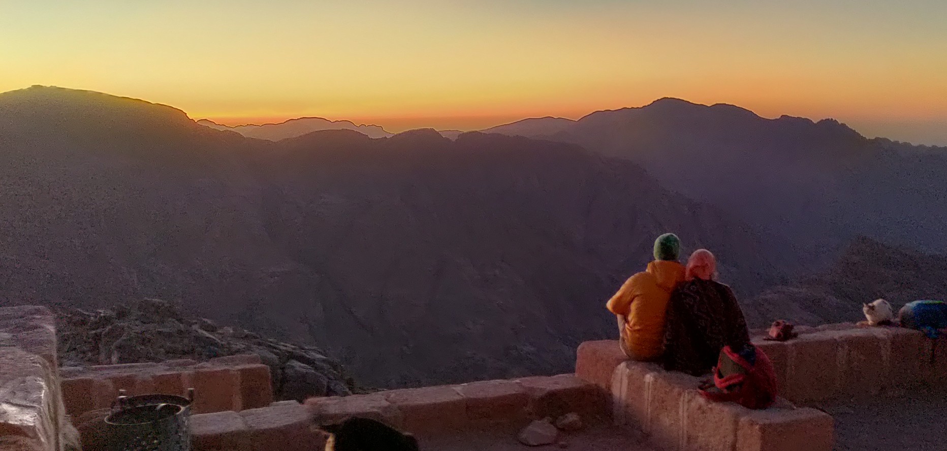 A Mózes-hegyen két szentély található. Az egyik egy kis mecset, a másik a Szentháromság-kápolna. A kápolna zárva, a mecsetet is csak reggel nyitják ki, ahol majd üldögélek fél órát. Elhelyezkedem a kőkerítésen, szemben a nappal, miközben a völgyből egyre több látogató érkezik. Macska telepszik az ölembe, mintha ez a világ legtermészetesebb dolga lenne. Ahogy a nap egyre lejjebb ereszkedik, olyan látványban van részem, amire nincsenek szavak. Színek kavalkádja, fény-árnyék játékok a horizonton, és az árnyékba boruló hegyoldalakon, amelyek először barnává, majd szürkévé válnak. Döbbenten nézzük, ahogy a hegyek mögött a nap utolsó sugarai aranyszínűvé kontúrozzák a hegycsúcsokat. Aztán ránk borul a sötétség.