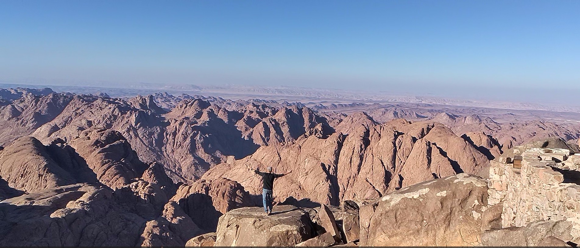 Előttem a turisták lekászálódnak a tevéről, és nekivágnak az utolsó 750 lépcsőfoknak, ahová csakhamar én is követem őket. Mózes negyven napot töltött itt. Én csak fél napot fogok. Vezetőm lemarad, az egyik pihenőhely sötét bejárata nyeli el. – Majd később találkozunk. – veti oda a válla felett. Amikor felérkezem a csúcsra, lágy szellő legyinti meg az arcom. Kellemes meleg fogad, kristálytiszta idő, azúrkék ég. Sehol egy felhő. Amíg a szem ellát, körbevesznek a Sinai-hegység rozsdabarna krokodilfogai. A völgy, ahonnan indultam, már nem több innen, mint egy rongyos zsebkendő.